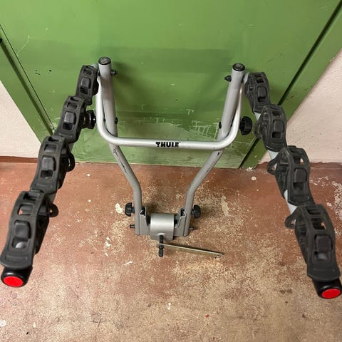 Thule cykelställ / cykelhållare för dragkrok med plats för 3 cyklar. Modell med bågar mellan cyklarna för fastsättning. Funkar väldigt bra och man slipper krånglet med att trä fästarmar genom flera ramar. Har fungerat bra att köra 3 st mountainbikes utan problem. Väl använt men fungerar som det ska och är stabilt. 7-polig kontakt för ljusramp.