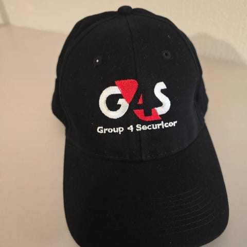 Svart mössa med broderad logotyp "G4S Group 4 Securicor" på framsidan. Baksidan har texten "Se upp i backen. Vi har ögon i nacken." broderad.