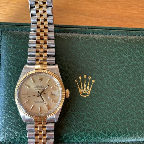 En tidlös klassiker med en unik touch – denna Rolex Datejust ref. 16233 från år 2001 kombinerar elegant design med robust kvalitet. Boetten och Jubilee-länken är utförda i en tvåtonskombination av rostfritt stål och 18K gult guld, vilket ger ett lyxigt men samtidigt mångsidigt uttryck.