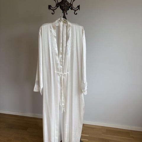 Helt underbar sammets-morgonrock i så vacker turkos färg. Mjuk och skön. Materialet är bomull med någon del polyester. Mycket gott skick. Uppskattad storlek S. Axelbredd 38 cm. Längd ca 110 cm, lite kortare framtill. Ärmlängd 42 cm. Finns vid Slussen TB Götgatan/Sankt Paulsgatan för upphämtning.