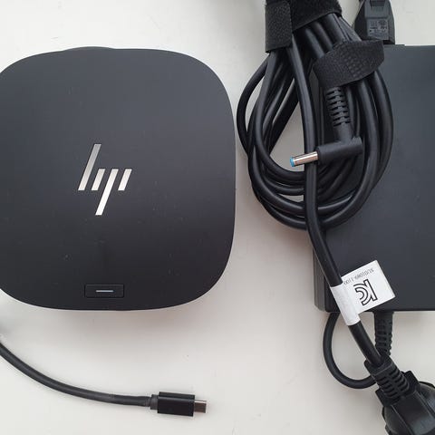 Dockningsstationen ansluts till datorn via USB-C och gör det enkelt att koppla in skärm, nätverk och tillbehör via en enda kabel. Vanlig modell som används till många HP-laptops men fungerar även med andra märken som stödjer USB-C med DisplayPort Alt Mode.