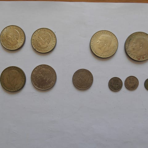 100x stycken Svenska 1 öre mynt i metall, samling av flera mynt i olika mängder och skick.