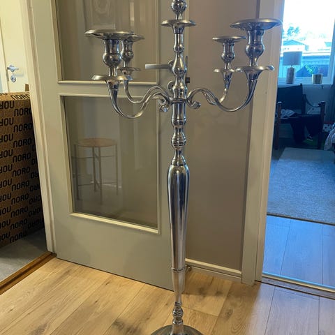 Säljer en femarmad golvkandelaber i silverfärgad metall. Kandelabern är i fint skick och stabil i foten. Passar för kronljus och är mycket dekorativ både till fest och som inredningsdetalj.