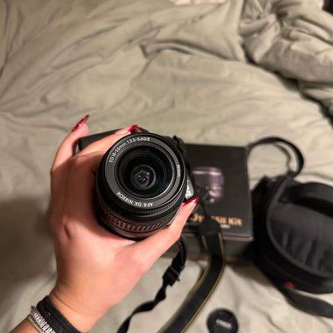 Nikon Digital systemkamera med objektiv och tillbehör inklusive batteriladdare och anslutningskabel. Kameran är avsedd för digital fotografering och har en svart design.