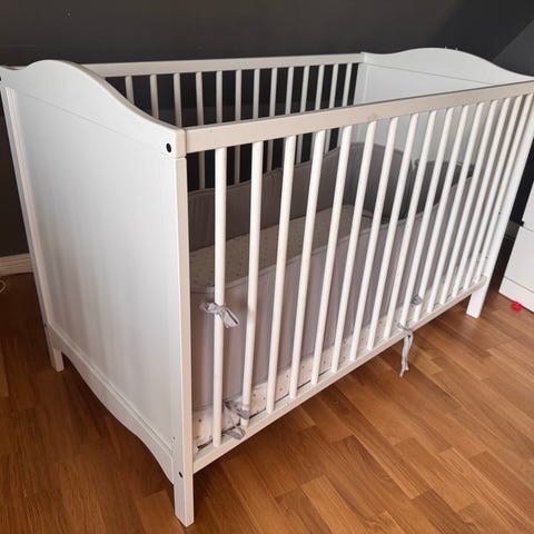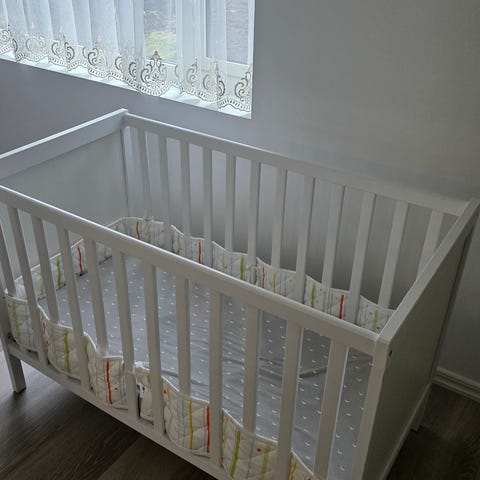 Madrass samt spjälsängsskydd medföljer om så önskas. Madrassen har alltid haft madrasskydd, själva överdraget till madrassen samt spjälsängsskyddet är nytvättat.
