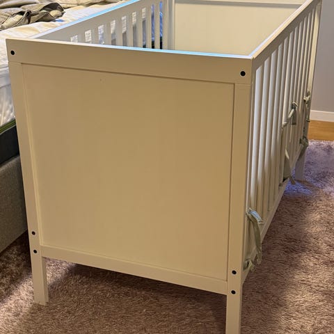 Spjälsäng från IKEA, modellen Smågöra. Dekorativ spegel på en av gavlarna i plast.