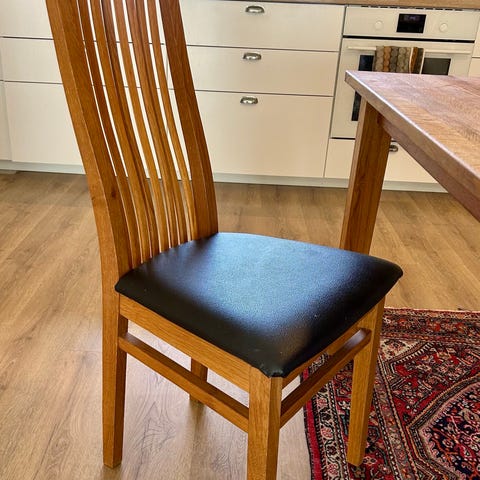 Säljer 6 st fina ekstolar, äkta skin från Bergmans. Har haft dem länge så de är lite rangliga och slitna på vissa ställen men är man lite händig så kan man säkert fixa det lätt. Inga sprickor i lädret vad jag kan se.