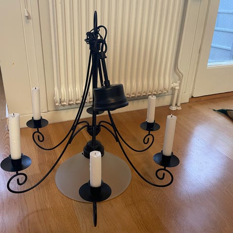 Äldre takkrona, förgylld mässing med kristaller. Kan även monteras med större glödlampor.