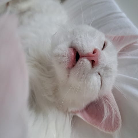 Han är 50 % Maine Coon och 50 % vit huskatt, vilket syns tydligt i hans stora öron, fluffiga päls och vackra teckning.