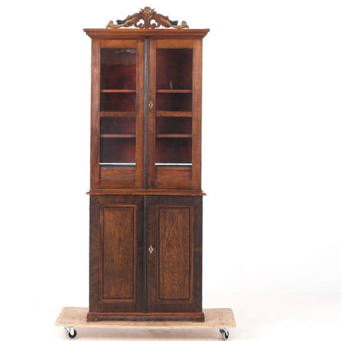 Fanerad. Skuren och svarvad dekor. Överdel med två dörrar och bakomvarande hyllplan. En låda undertill. Underdel med ett dörrpar.
