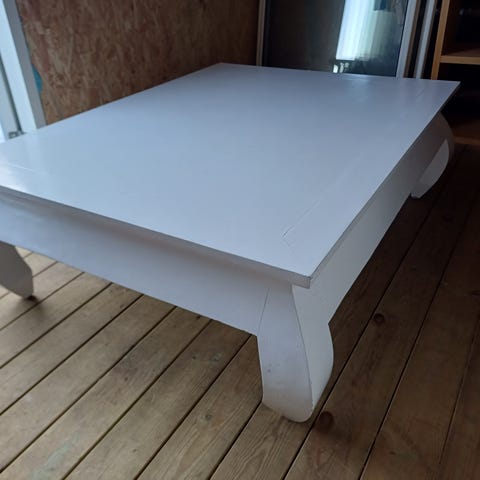 Bord med skiva av kubb, specialtillverkat av möbelsnickare. Underrede tillverkat i mdf, målat i en ljusgul kulör (kan enkelt målas om).