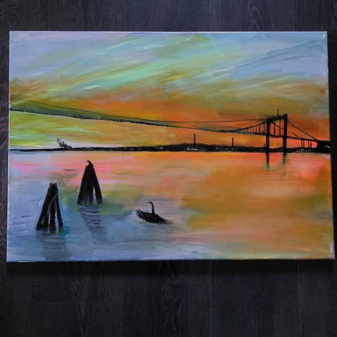 Oljemålning Tavla med asiatisk motiv som visar personer på en brygga och en båt, med ett träd med röda löv i bakgrunden. Dominerande färger är rött, vitt och grått. Passar som väggdekoration i olika rum.