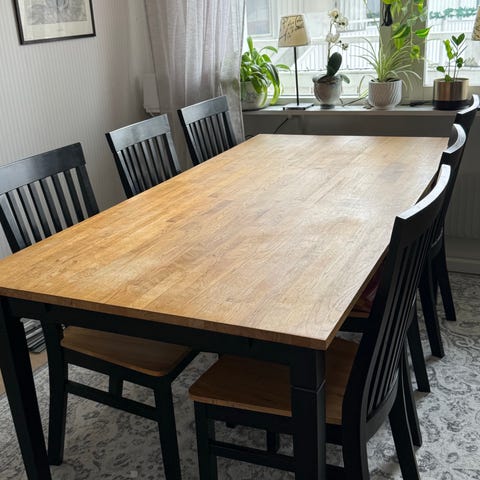 ekbord samt 4 stolar. Bordet är fem år men väldigt fint. Stolarna är bara 6 månader.