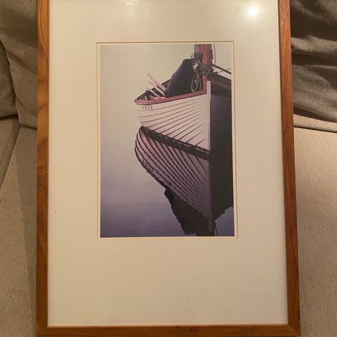 Inramad växttavla med motiv av en palm. Tavlan har en svart ram med dekorativa detaljer och en bakgrund som liknar en gammal karta. Köpt från Newport. St B 58 cm L 49