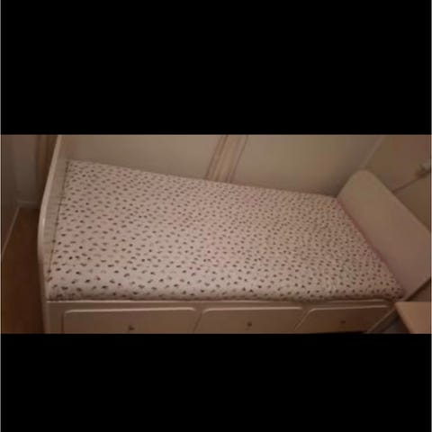 IKEA säng med madrass. Produkten består av en sängstomme och en madrass i standardstorlek (90 x 200 cm). Färgen är ljus och materialet är textil. Sängen är lite skadad pga att vi har katter plus haft en hel kattkull. Sängen har några fläckar som inte är allt för tydliga men syns om man kollar nära. Sängen är för annars stabil och bra i grunden. Vill bli av med så fort som möjligt då den bara står och tar plats i vårat vardagsrum.