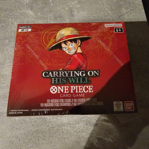 En oöppnad booster box från One Piece Card Game, The Azure Sea's Seven. Innehåller 24 booster packs, 12 kort per pack.