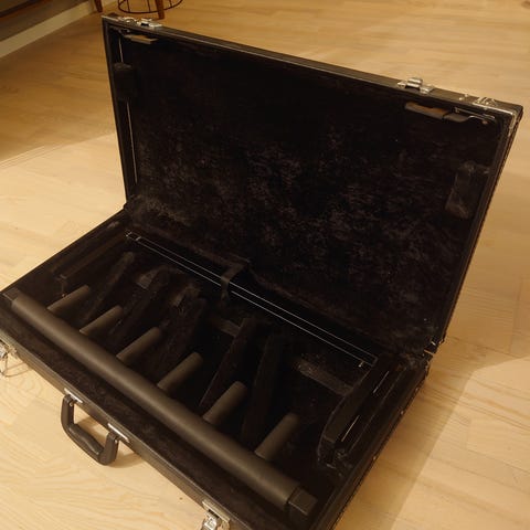 Perfekt för studio, replokal eller livebruk. Kraftig konstruktion och gummibeklädda hållare som är skonsamma mot instrumentens lack. Gummit har blivit lite klibbigt och fästet/handtaget som man reglerar höjd med är lite tejpat, se bild. Men allt funkar som det ska.