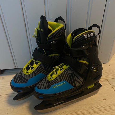 Tecno Ishockeyskridskor för barn i storlek 30, blå färg. Skridskorna är avsedda för ishockey och har spännen för justering och stabilitet.