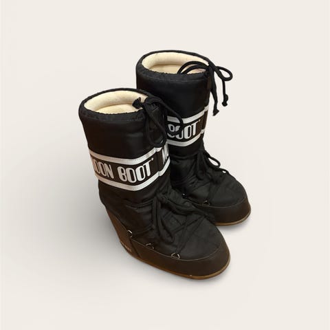 Moon Boot Low Aspen i storlek 38. Skorna är svarta och har en vadderad design med snörning framtill. Materialet är delvis glansigt med metalliska detaljer på baksidan. Waterproof. Använda ett fåtal ggr. Som nya!