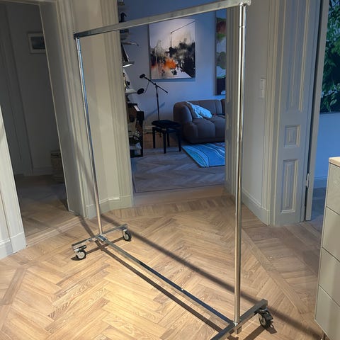 Metallställ för förvaring i svart färg. Stället har flera fack för att organisera och förvara olika föremål. Designen är enkel och funktionell, lämplig för användning i hem eller kontor.