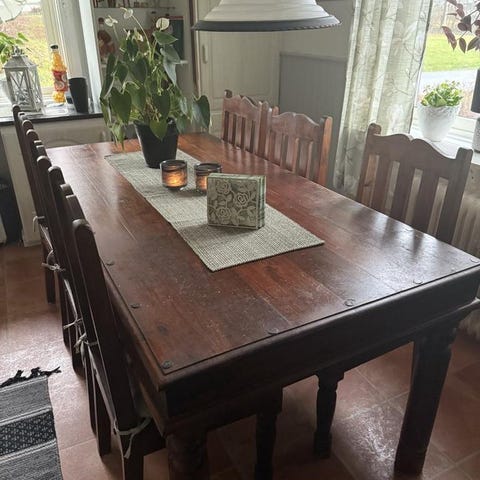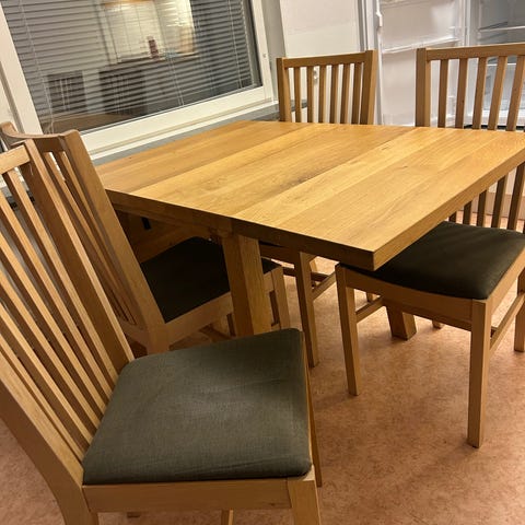 Säljer mitt bord samt 4 stolar. Väldigt fint skick, stolarna är snurrbara.