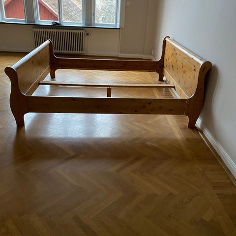 sängram i trä med dekorativa detaljer. Sängramen är i brunt trä och har en klassisk design med utskurna mönster på huvudgaveln och fotänden. Passar för standardmadrass. Sängramen är avsedd för användning som sängmöbel.