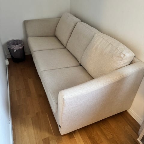 Grå soffa, bredd ca 210 cm, djup ca 90 cm, höjd ca 80 cm och sitthöjd ca 45 cm.