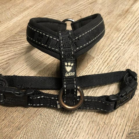 Hurtta Hundsele i röd och svart färg. Selen är designad för att ge bekvämlighet och kontroll vid promenader med hunden.