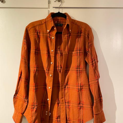 Röd och svart ullskjorta med långa ärmar. Skjortan har en bröstficka och broderad logotyp på kragen.