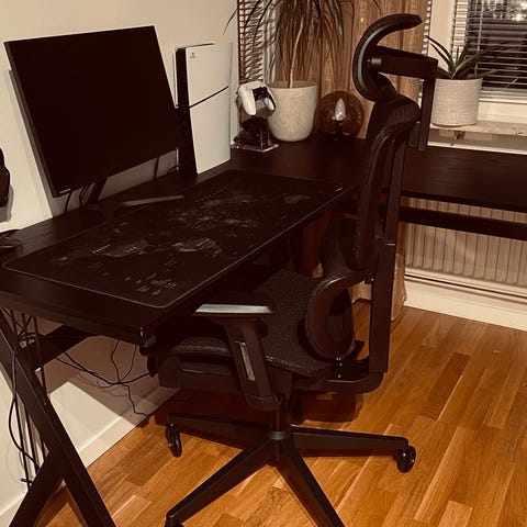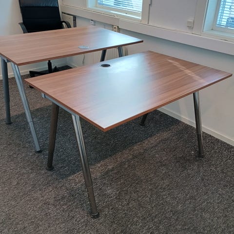 Lite skav från användande på skrivbordsskivan. Höger luckhållare/arm har tappat sin möjlighet till höjdjustering. Skivan hänger stabilt och rakt ändå, men ersättningsbelopp kan hittas på Theofils.