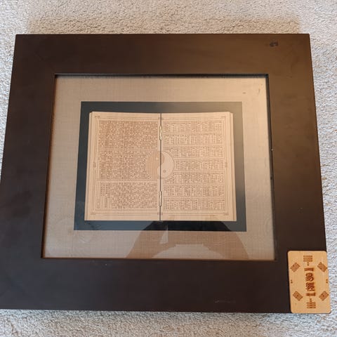 Kinesisk handmålad rulle med klassiskt landskapsmotiv i traditionell stil. Motiv i svartvitt med inslag av brunt, föreställande berg, träd och vatten. Rullen är monterad på tyg med mönstrad kant i ljusa färger. Lämplig för väggdekoration. Text på mandarin: Höstens färger är som en utsmyckad fager brud"