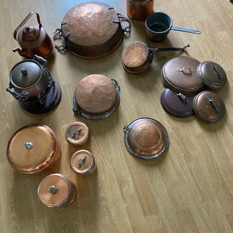 Set med koppar köksredskap och bakformar i olika storlekar och former. Materialet är koppar och produkterna är avsedda för matlagning och bakning.