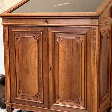 En charmig möbel som kombinerar praktisk förvaring med klassisk design. Överdelen är vackert snidad, dörrarna har dekorativa paneler och de spiralvridna benen gör möbeln till ett blickfång i rummet. Utmärkt som barskåp, hallbord eller avlastningsmöbel.