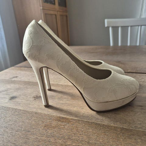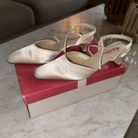 Mina bröllopsskor. Mycket bekväma. Skorna har en rundad tå och en låg, bred klack. Som en ballerinasko med klack, transparent tyg.
