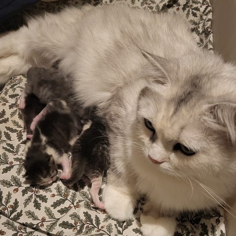 Vår underbara kattmamma (50% Ragdoll, 50% Brittisk långhår, vit med gråa detaljer) och vår vackra kattpappa (100% Brittisk långhår, helvit) har den 4 december 2025 fått en liten kull fantastiska små kattungar. Båda föräldrarna har klarblå ögon, är lugna, sociala och kärleksfulla – och de egenskaperna har de fört vidare till sina ungar.
