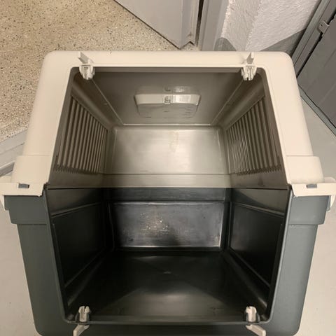 Fullt fungerande kattbur med bärhandtag.