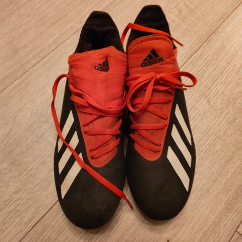 Adidas Predator fotbollsskor i blå och orange färg. Skorna har snörning och är designade för fotbollsspel med dobbar under sulan för bättre grepp på gräsytor.