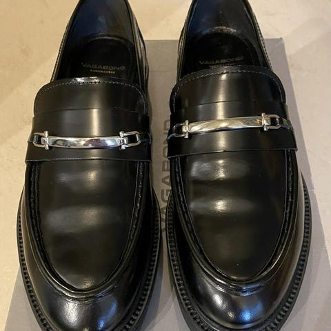 Vagabond Loafers i svart färg, storlek 36. Skorna är tillverkade i läder och har en klassisk design med metalldetaljer fram. Passar för vardagligt bruk och formella tillfällen.