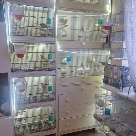 Fågelburar i trä och metall med flera fack och dörrar. Passar för uppfödning eller förvaring av fåglar. Varje bur har en vattenflaska och en sittpinne. Burarna är placerade i en vit hylla med förvaringslådor längst ner.