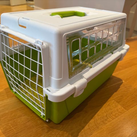 Transportbur för husdjur. Burens delar kan tas isär för rengöring och förvaring. Burens storlek och material gör den lämplig för transport av små till medelstora husdjur.