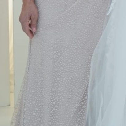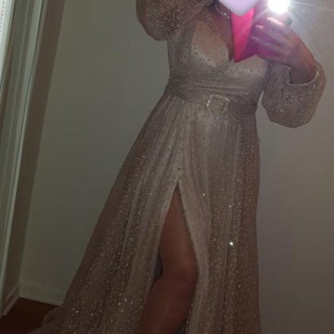 Klänningen har burits ett par gånger men är i fint skick. Någon pärla har trillat av på axelbanden men inget som märks då det är många olika pärlor påsydda och allt smälter samman.
