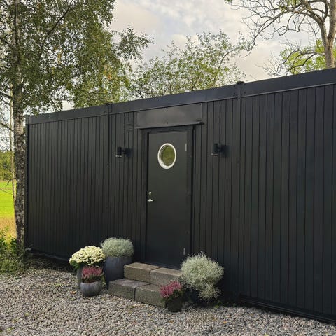 Attefalls hus i behändig storlek. Tillfällig dörr finns monterad