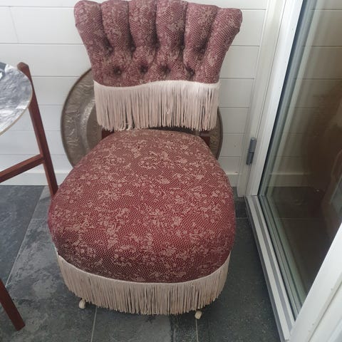 Fin fåtölj, saknar en trädetalj vid armstödet, annars är den tydligt sparsamt använd under åren, sitsen är i toppskick.