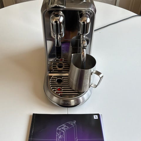 Nespresso Creatista Plus espressomaskin i rostfritt stål. Utrustad med digital display och flera dryckesinställningar för kaffe och espresso. Passar för hemmabruk och erbjuder olika val för kaffestyrka och mjölkskumning. Inklusive kapselhållare och mått för mjölk.