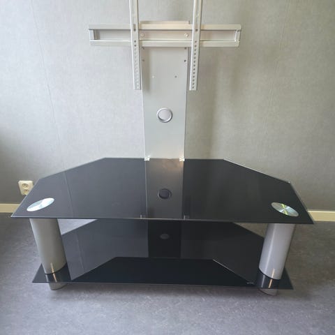 Svart tv-bänk med rökfärgade glasdörrar med 2 våningsplan per sida