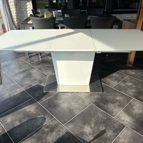 Vitt rustikt matbord i trä 180x90 med extra skiva som är 50 cm bred