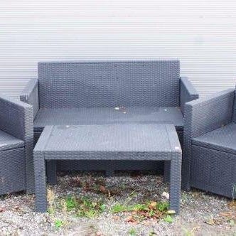 Svart trädgårdsset bestående av ett runt bord med glasskiva och två stolar i flätad design. Ganska slitna och lite rostigt på vissa ställen
