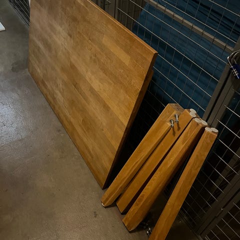 Matbord ek samt 6 stolar med skinnklädd sittdyna. Finns ilägg skiva 70 cm