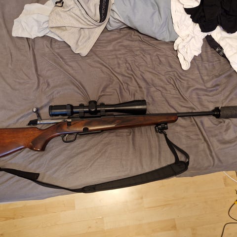 Kolven är knäckt. Dock i snygga brottytor. Kan kanske fixas så att det håller. Dock inte av mig. Mekanism och pipa i gott skick och lite synd att skrota. 5-skotts magasin medföljer. Möjligt fynd för den som är händig med fräs o stämjärn. Licens krävs såklart.