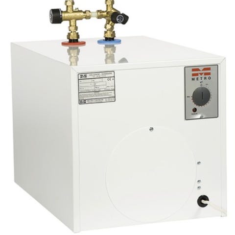 Metro Varmvattenberedare med en kapacitet på 200 liter. Utrustad med reglerbar temperaturinställning och anslutningar för vatten och el. Passar för installation i bostäder eller mindre fastigheter för varmvattenförsörjning.